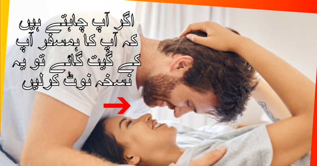 اگر آپ چاہتے ہیں کہ آپ کا ہمسفر آپ کے گیت گائے تو یہ نسخہ زندگی بدل دینے والا نسخہ ھے۔ عورت بالکل خوش ھوجاے گی اور زندگی بھراپ کے ساتھ رھے گی۔اپ کو کھبی ٹھکرا کر نئں جاے گی۔